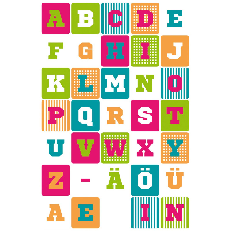 Papīra uzlīmes kvadrātveida formā ar burtiem un daudzkrāsainu dizainu. Iepakojumā iekļautas uzlīmes A - Z, kā arī burti ar umlautu ( ä, ö, ü). Lieliski piemērotas individuālai un bērniem draudzīgai marķēšanai, organizēšanai, kā arī izglītojošām nodarbībām.