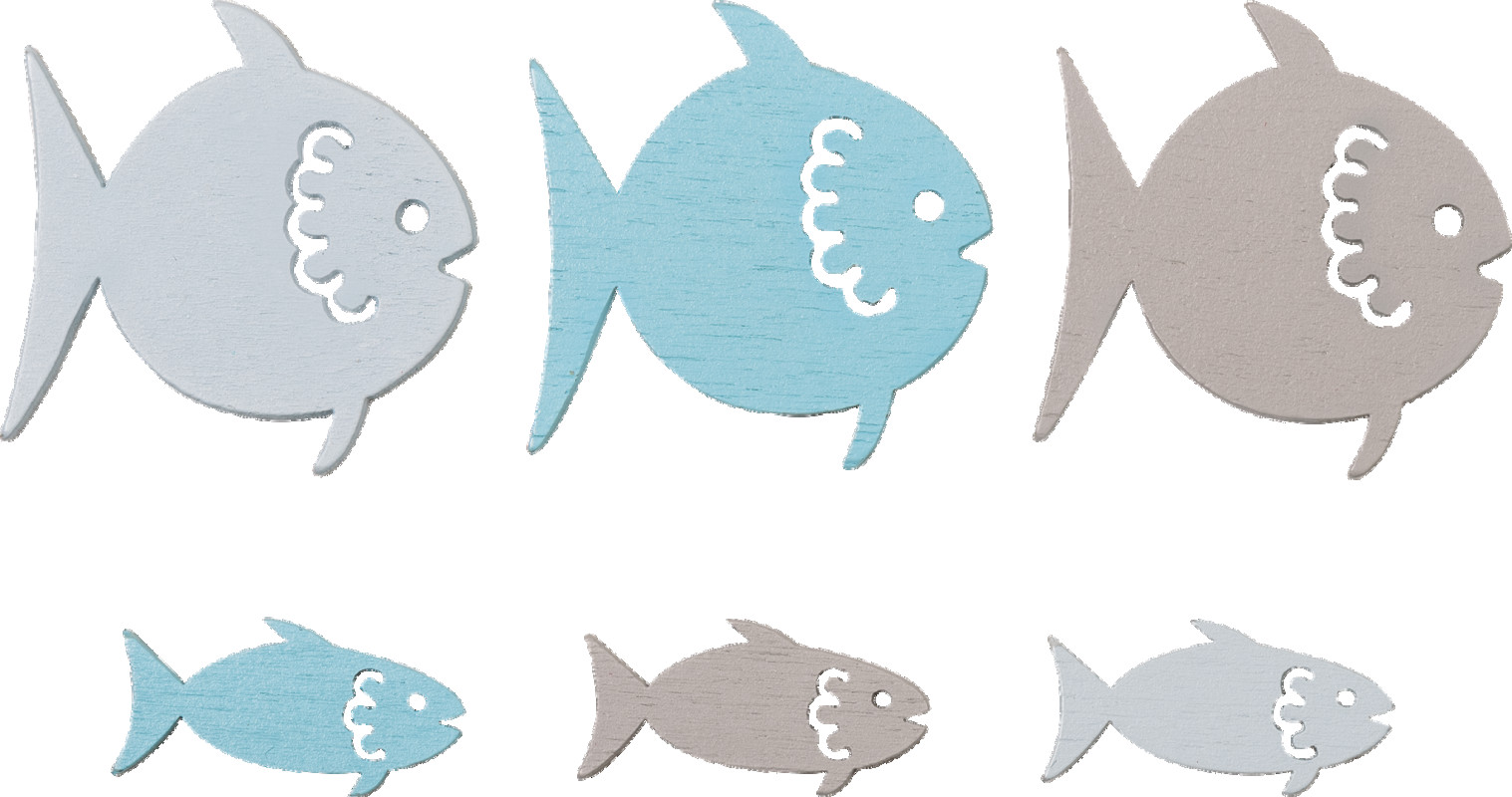 Koka dekoru komplekts ar dažādu krāsu un divu izmēru zivtiņu dekoriem, koka kastītē ar nodalījumiem. Lieliski piemērots dažādu rokdarbu veikšanai, kā arī dekorāciju veidošanai, figūrām ir iegriezumi, kas ļauj tās uzvērt uz auklas.