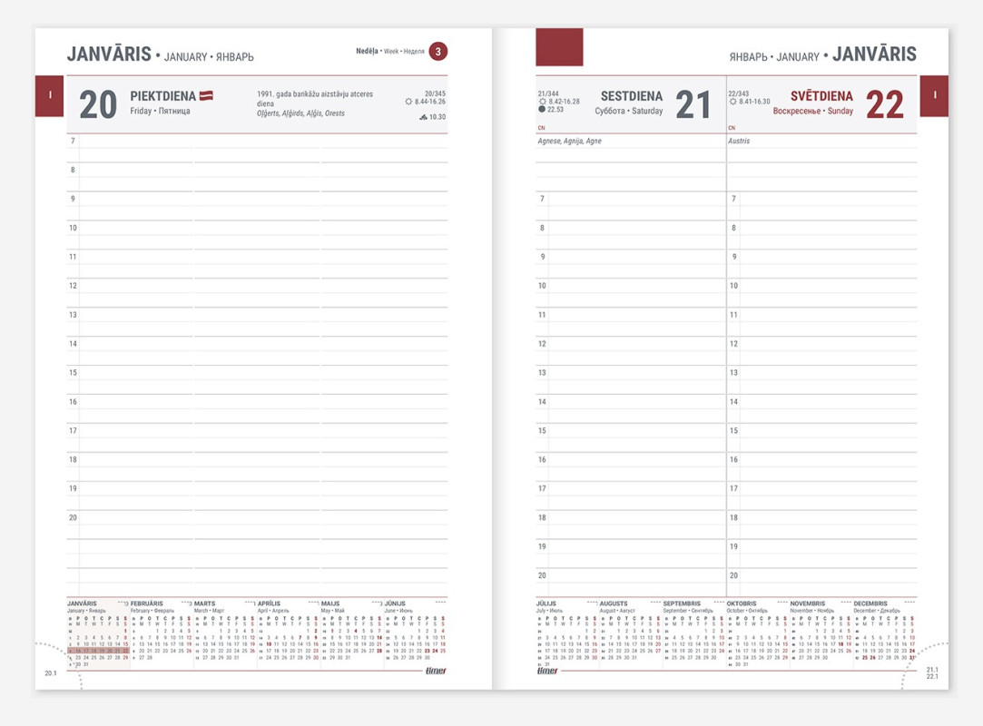 Apraksts: Visās A5 formāta dienasgrāmatās ir tabulas kalendārs, gada plāns, nedēļu numerācija, valsts svētku un atzīmējamās dienas, karogu dienas, vārda dienas, 38 citu valstu svētku dienas, norādīta pāreja uz vasaras un ziemas laiku, gadalaiku sākums, saullēkta un saulrieta laiki, mēness fāzes, zodiaka zīmju maiņas dienas, kontaktu un piezīmju lapas.