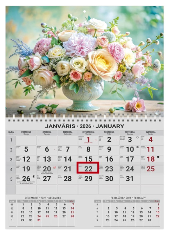 Apraksts: Kalendārā ir valsts svētku un atzīmējamās dienas, karogu dienas, vārda dienas, 38 citu valstu svētku dienas, nedēļu numerācija, norādīta pāreja uz vasaras un ziemas laiku, gadalaiku sākums, saullēkta un saulrieta laiki, mēness fāzes, zodiaka zīmju maiņas dienas.