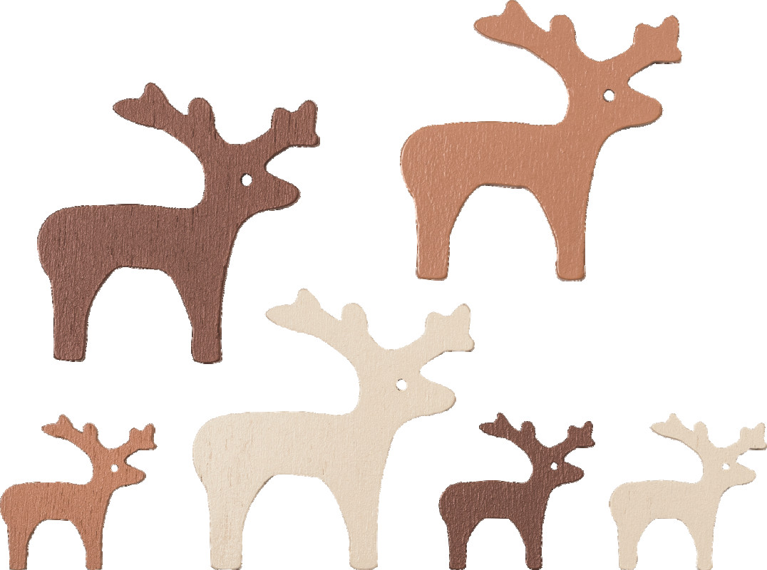 Koka dekoru komplekts ar dažādu krāsu un divu izmēru ziemeļbriežiem, koka kastītē ar nodalījumiem. Lieliski piemērots dažādu rokdarbu veikšanai, kā arī dekorāciju veidošanai, figūrām ir iegriezumi, kas ļauj tās uzvērt uz auklas.