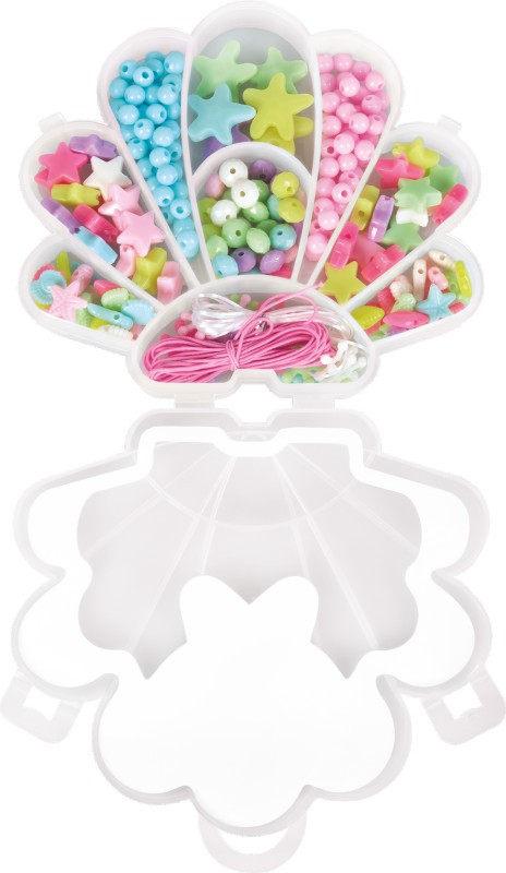 Plastmasa pērlīšu komplekts jūras gliemežvāka formas kastītē ar nodalījumiem. Komplektā ietilpst balta un rozā gumijas aukla rotu veidošanai un dažādu krāsu, izmēru un formu pērlītes. Pērlītes ir apaļā formā, zvaigznes formā, jūras zirdziņa formā, jūras zvaigznes formā, kā arī gliemežvāka formā.