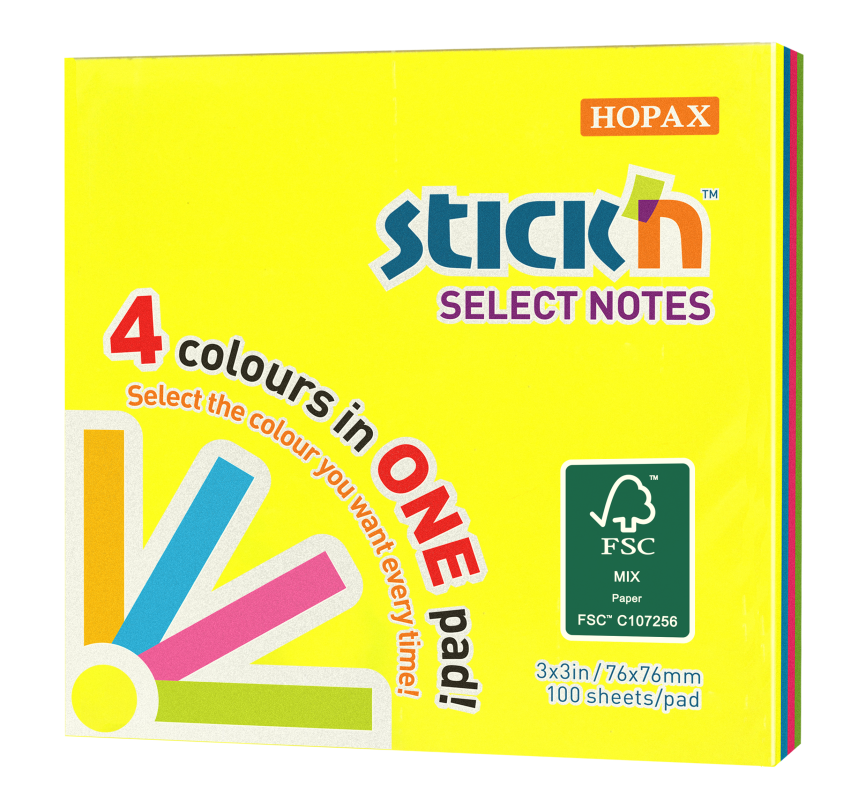 Līmlapiņas 76x76mm 100l. neona krāsās Stick'N